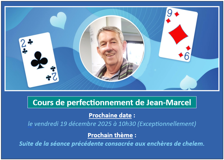Les cours de perfectionnement au bridge sont donnés par Jean-Marcel un vendredi sur deux à 10h00 au Club